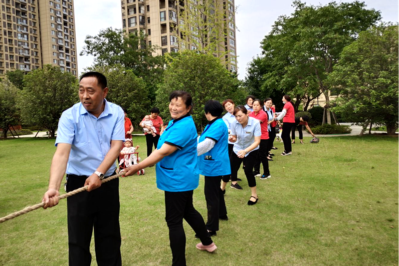 包粽子比赛进行的同时,紧张激烈的拔河比赛也吹起了哨声。两支队伍随着裁判员的一声令下,纷纷拼尽全力投入比赛,现场欢呼声、呐喊声此起彼伏,大家一起为参赛者加油助威。
